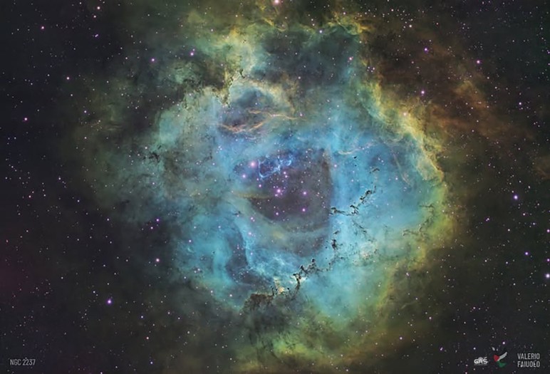 La Nebulosa Rosetta (NGC 2237–9) è una vasta regione di formazione stellare situata nella costellazione dell’Unicorno. Si tratta di una classica nebulosa ad emissione, il cui aspetto a guscio è modellato dall’intensa radiazione proveniente dall’ammasso aperto NGC 2244, visibile al centro della struttura. Le stelle giovani e massicce dell’ammasso ionizzano il gas circostante, scavando cavità e fronti luminosi che definiscono l’inconfondibile morfologia della nebulosa.
