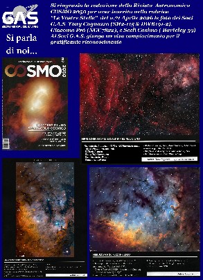 Si ringrazia la redazione della Rivista Astronomica COSMO 2050 per aver inserito nella rubrica “Le Vostre Stelle” del n.71 Aprile 2026 le foto dei Soci G.A.S Tony Cagnazzo (SH2-