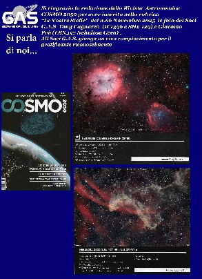 Si ringrazia la redazione della rivista Astronomica mensile COSMO 2050 per aver inserito nella rubrica "Le vostre Foto" i lavori dei Soci G.A.S. Lino Benz di Sannicola (LE) (resto di Supernova SNR G206.9+2.3), Seclì Cosimo di Novoli (LE) (NGC2264 e Christams Tree), Calcagno Raffaele&Vergine Maria Rosaria di Faggiano (TA) (IC443 Jellyfish nebula), e Falerno Simone di Taranto (NGC1499 California Nebula).