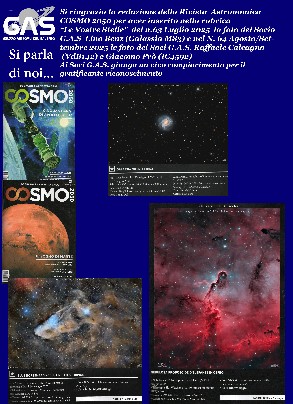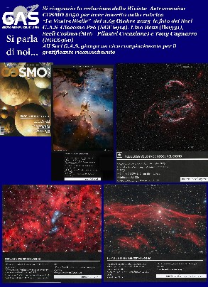 Si ringrazia la redazione della rivista Astronomica mensile COSMO 2050 per aver inserito nella rubrica "Le vostre Foto" i lavori dei Soci G.A.S. Lino Benz di Sannicola (LE) (resto di Supernova SNR G206.9+2.3), Seclì Cosimo di Novoli (LE) (NGC2264 e Christams Tree), Calcagno Raffaele&Vergine Maria Rosaria di Faggiano (TA) (IC443 Jellyfish nebula), e Falerno Simone di Taranto (NGC1499 California Nebula).